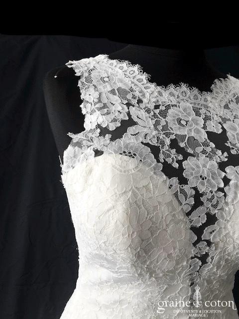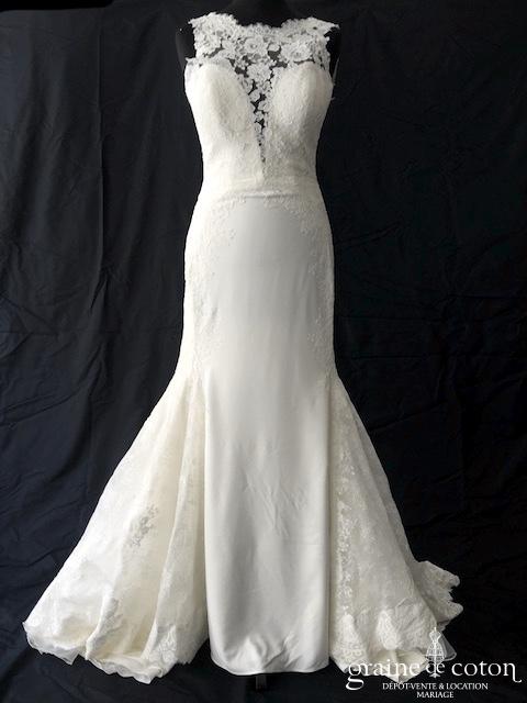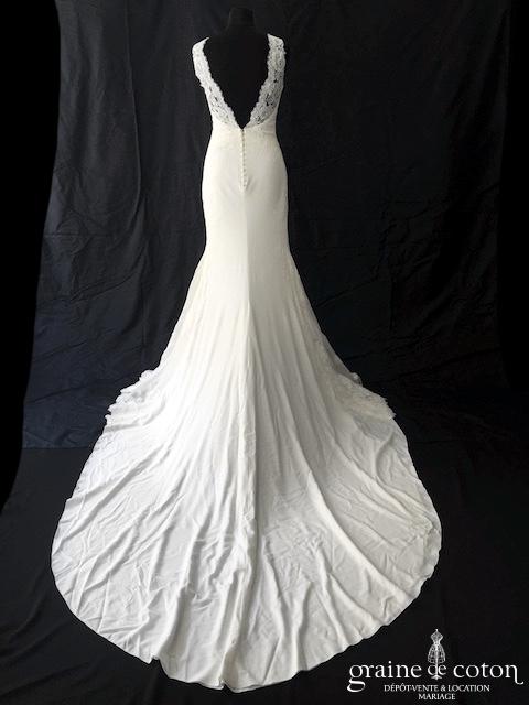 Robe une pièce ivoire clair : top en dentelle avec bretelles et dos nu profond en V. Jupe sirène en crêpe avec finitions dentelle, longue traîne. Glamour et lumineuse.