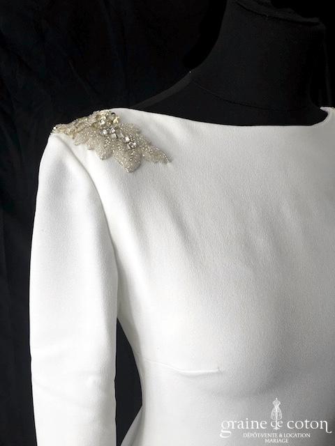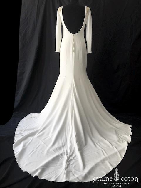 Robe une pièce tout en crêpe de soie Isabelle. Top à manches longues boutonnées et dos nu jusqu’au creux des reins. Ornements aux épaules ajoutés, en perles. Dos boutonné. Jupe sirène légèrement évasée sur le bas, avec longue traîne pouvant se relever. Classe, glamour et épurée.
