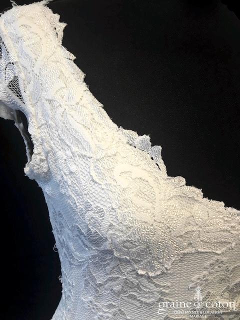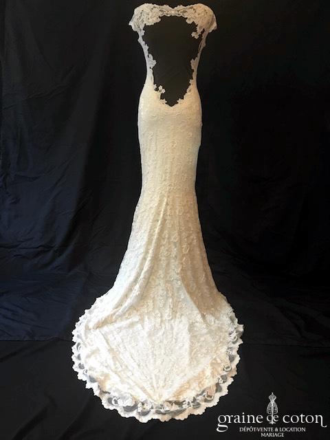 Robe une pièce tout en dentelle stretch : haut avec larges bretelles et petites manches, dos nu recouvert de tulle chair invisible pour une parfaite tenue. Jupe fourreau avec traîne ornée de dentelle. Chic et ultra confort.