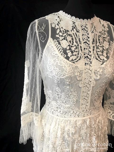Robe en deux pièces ivoire : sous robe en crêpe fin fluide. Sur robe en bandes alternées de tulle plumetis et guipure, effet vintage, col rond. Manches 3/4 avec volant de tulle. Finition ourlet bordé de dentelle. Bohème chic par excellence : légère et champêtre.