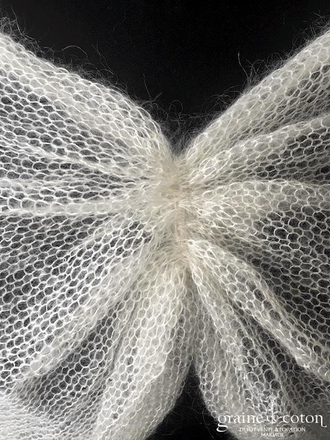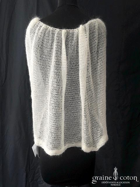 Cape écrue 60% mohair et 40% soie. La dimension du col est réglable : elle se porte aussi bien proche du cou, dénudée sur les épaules ou encore en V plongeant. En position plus large, elle fait office d’écharpe façon, snood chaud pour être portée au quotidien. Plusieurs couleurs disponibles sur commande (couleur : à l’achat uniquement).