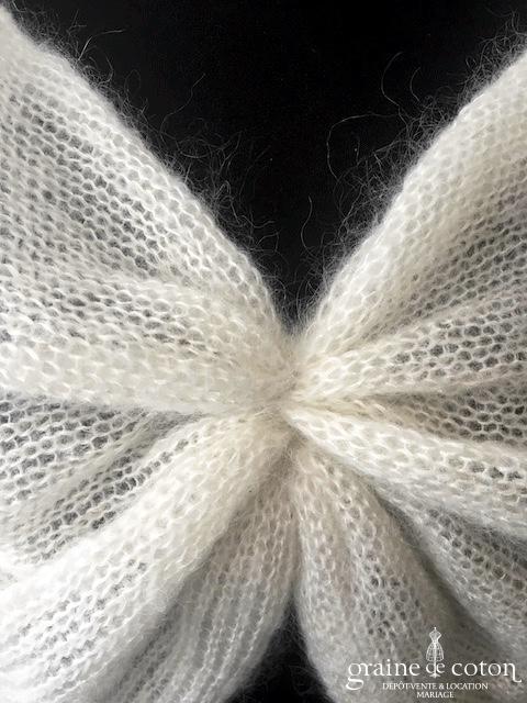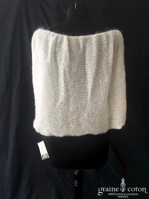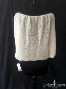 Cape écrue 80% mohair et 20% soie. La dimension du col est réglable : elle se porte aussi bien proche du cou, dénudée sur les épaules ou encore en V plongeant. En position plus large, elle fait office d’écharpe façon, snood chaud pour être portée au quotidien. Plusieurs couleurs disponibles sur commande (couleur : à l’achat uniquement).
