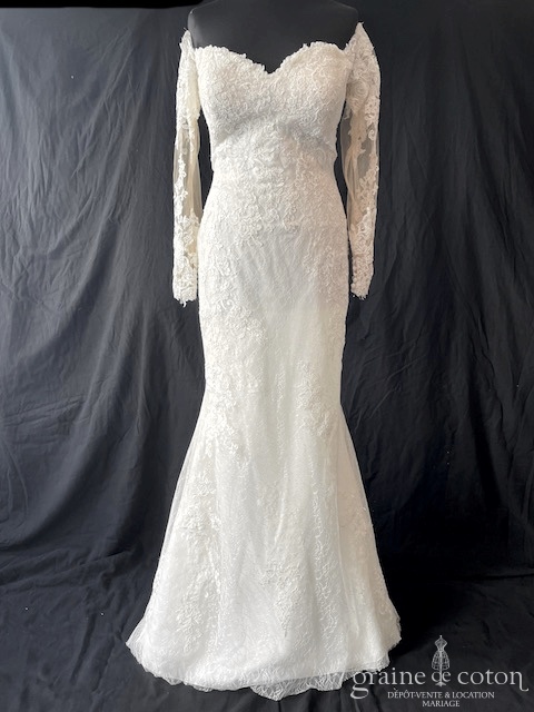 Robe une pièce tout en dentelle ivoire clair : top encolure bateau avec manches longues, dos boutonné. Jupe sirène fluide avec traîne pouvant se relever. Glamour et bohème.