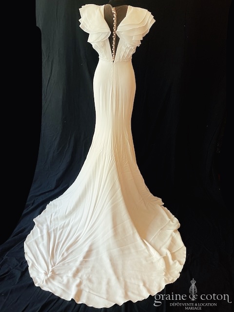 Robe une pièce en crêpe et organza ivoire clair : top avec volants d’organza pour les manches, décolleté en V et dos entièrement boutonné. Jupe sirène fluide épurée avec très longue traîne. Originale et glamour.