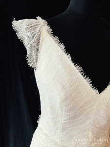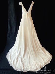 Robe une pièce ivoire clair : top à bretelles en dentelle, décolletés V et dos nu. Jupe taille haute, en mousseline fluide, traîne. Seyante et raffinée.