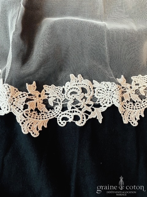 Voile long en soft tulle ivoire bordé d’une guipure fleurie. Monté sur peigne, sans rabat avant. Longueur : 220 cm.