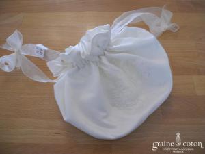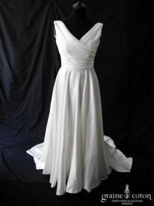 – une création en satin ivoire clair de Jesus Peiro, ligne pure drapée avec larges bretelles, dos nu en V, jupe fluide évasée. Délicate, sobre et classe ! Taille 36, référence 3821.