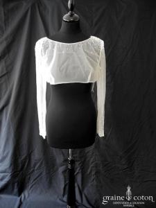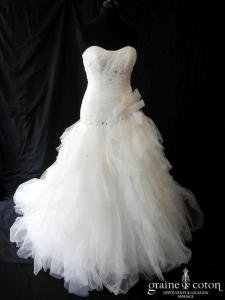 – le modèle « Duchesse » d’Hervé Mariage en tulle drapé et mouchoirs de tulle ivoire clair, fantaisiste, lumineuse et seyante. Taille 38, référence 3925. Boléro idéalement assorti référence 3924.