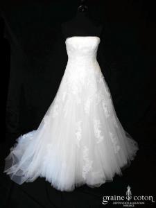 Dépôt du modèle « Donaire » de Pronovias, en tulle et dentelle ivoire clair, tombé fluide tout en volume. Elégante et raffinée. Taille 38, référence 4005.