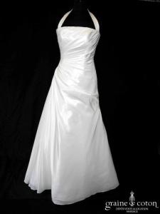 Dépôt du modèle « Soleil » de Lili la mariée, un beau drapé de taffetas avec bretelle tour de cou amovible. Pure, sobre et lumineuse. Taille 36-38, référence 4160.