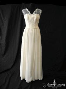– un modèle d’Alexandra Berthet en dentelle brodée et tulle plumetis, fluide et travaillée avec effet vintage. Taille 38, référence 4202.