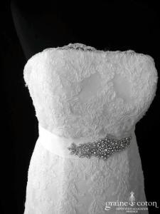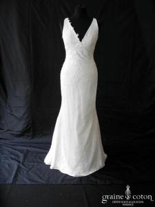 – la robe « Bali » de Cymbeline, tout en dnetelle de Chantilly avec joli décolleté sur les épaules. Belle ligne. Taille 38, référence 4384.