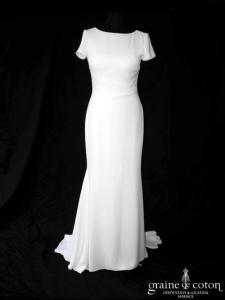 – le modèle « Valeria » de l’Atelier Pronovias, sublime tombé en crêpe de soie et dos nu. Sbre et efficace. Taille 38, référence 4392.