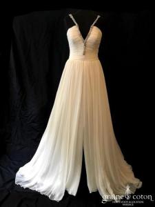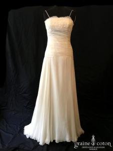 – une création italienne haute gamme de Galvan Sposa, en mousseline de soie fluide, décolleté V : sobriété et pureté soulignés par des bretelles de strass. Taille 38, référence 4434.