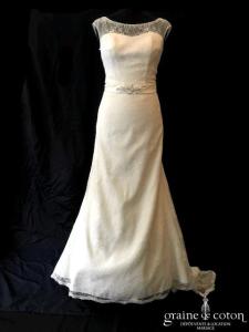 – la robe « Kate » d’Hervé Mariage, avec son encolure bateau, tout en dentelle : raffinée et délicate. Taille 36, référence 4442.