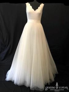 Petite erreur de référence (c’était pour le suspens ;o), voici le modèle « Estelle » de Marie Laporte, en crêpe et tulle plumetis, beau dos nu festonné. Originale et bohème. Taille 40, référence 4453.