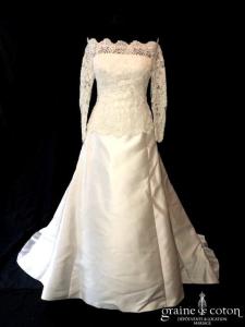 – le modèle « Dilan » de Pronovias, en mikado habillé d’un boléro à manches 3/4 en dentelle, décolleté bateau. Sobre et classe. Taille 38, référence 4444.