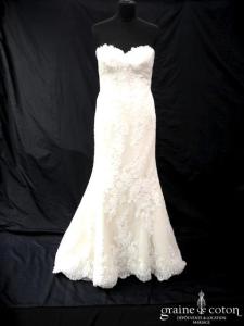 – un prototype Pronovias forme sirène tout en dentelle ivoire clair, lumineuse et glamour. Taille 36, référence 4464.