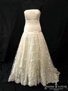 – le modèle « Ursino » de Pronovias, une robe sirène tout en dentelle ivoire et ivoire clair avec bretelle asymétrique. Jupon en tulle inclus pouvant se porter sur la jupe pour un effet robe princesse avec traîne et s’ôter ensuite : une robe deux-en-un ;o) Taille 38-40, référence 4537.
