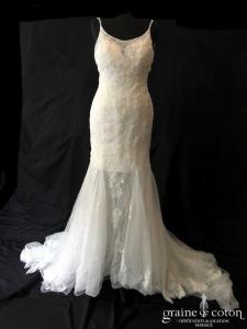 – le modèle « Reims » de Priam, sirène en dentelle fluide, transformable en robe bustier courte en ôtant la sur-robe de dentelle. Glamour et légère. Taille 38, référence 4592.