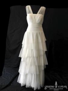 – création de Tadashi Shoji en tulle fluide, étagée de volants, taille haute avec bretelles drapées. Légère et aérienne. Taille 40, référence 4593.