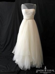 – le modèle « Michigan » de Pronovias, tout en tulle souple ivoire clair, facilement accessoirisable avec un boléro en tulle ou dentelle. Pure et lumineuse. Taille 40, référence 4860.
