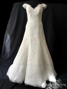 – le modèle « Batala » de Pronovias, tout en dentelle avec petites manches sur les épaules. Taille 38, référence 4875.