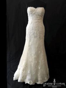 – la robe « Primael » de Pronovias, forme sirène avec dentelle de coton et guipure, classe et glamour, magnifiques coupe et matière. Taille 34-36, référence 5090.