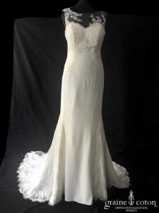 Dépôt du modèle sirène « Vosges » de Pronuptia, en crêpe et dentelle, fluide et glamour. Taille 42-44, référence 5492.