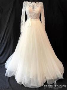 – le modèle « Bambu » de Aire Barcelona, princesse en tulle fluide et top dentelle à manches longues. Taille 36, référence 5969. Voile idéalement assorti référence 5968.