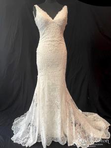 Dépôt du somptueux modèle « Galia » de White Boutik en dentelle perlée, coupe fourreau, décolleté V et dos nu. Lumineuse et seyante ! Taille 36-38, référence 6010.