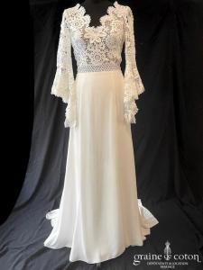 – la création « Eclipse » de Silvia Fernandez, fourreau esprit bohème en crêpe de soie et guipure, manches 3/4 évasées. Taille 36, référence 6034.