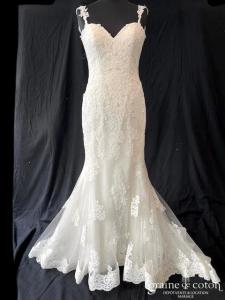 Dépôt du modèle « Renzo » d’Alma Novia, tout en dentelle ivoire avec décolleté coeur et dos nu en V. Somptueuse ;o) Taille 38, référence 6041.