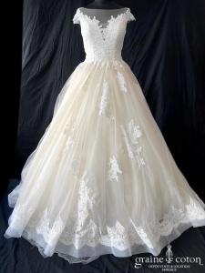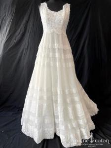 – la robe « Enya » d’Aire Barcelona, empire en tulle et dentelle fluide et vaporeuse. Taille 44, référence 6058.