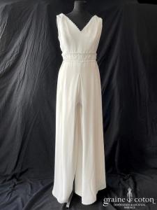– la combinaison « Vaily » d’Aire BArcelona » en crêpe ivoire clair et guipure : originale et élégante pour une cérémonie civile. Taille 44, référence 6059.