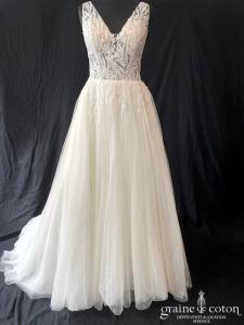 – le modèle « Powell » de Pronovias, en tulle et dentelle délicatement perlée, coupe princesse pour un esprit bohème. Taille 36-38, référence 6070.