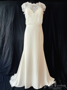 – une création Bo’M en crêpe et fine dentelle ivoire, coupe fourreau : élégante et raffinée. Taille 42, référence 6175.