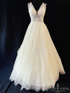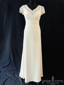 – la création « Alix » d’Elsa Gary en mousseline et fine dentelle, coupe caractéristique de la créatice : bohème champêtre. Taille 38-40, référence 6207.