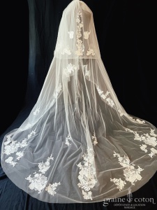 – la robe « Jago » de San Patrick : princesse en tulle fluide, magnifique dos en transparence. Taille 38-40, référence 6200 et son voile assorté référence 6201.