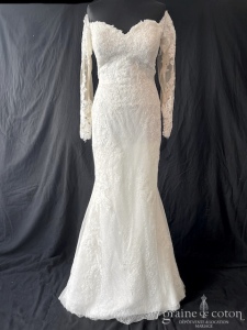– le modèle sirène dentelle « Lily » de White One pour Pronovias, glamour bohème avec son encolure bateau : taille 44-46, référece 6208.
