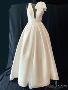 – la création « Margot » de Vera Wang pour Pronovias, en mikado, gros noeud sur l’épaule : élégante et intemporelle. Taille 40-42, référence 6217.
