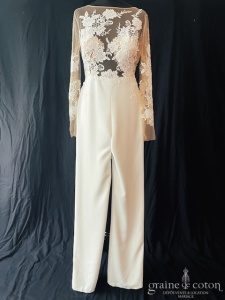 – la combinaison-robe de Manu Garcia en crêpe et dentelle, avec une sur jupe totalement amovible pour un effet robe en début de journée. Originale et seyante. Taille 40-42, référence 6218.
