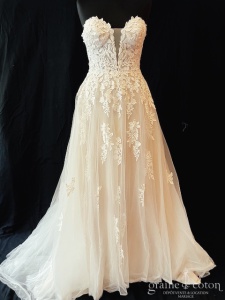 – la robe « Yaris » de Rosa Clara en guipure sur fond nude, bustier coeur harmonieux et seyant. Taille 38-40, référence 6269.