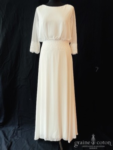 – le modèle « Maelia » d’Alma Novia en mousseline fluide, plumetis et guipure : raffinée et délicate, style années 20. Taille 36-38, référence 6270.