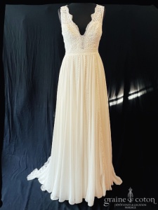 Dépôt du mofèle « Efigie » de Pronovias, bohème fluide en mousseline et guipure, dos nu en V. Taille 44, référence 6284.