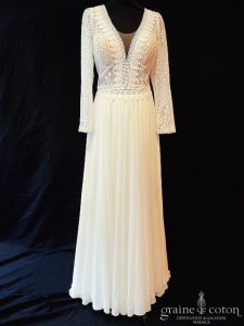 – le modèle « Gaby » de MS Moda en guipure et mousseline : seyante et lumineuse, elle sublimera sa mariée ;o) Taille 42-44, référence 6322.
