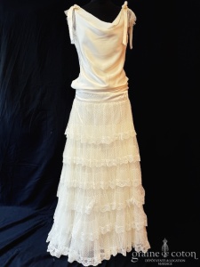 – une création Marie Laporte en satin de soie et volants de tulle plumetis : style années 20, légère et raffinée. Matières de grande qualité pour une mariée bohème chic tout en originalité. Taille 40, référence 6323.