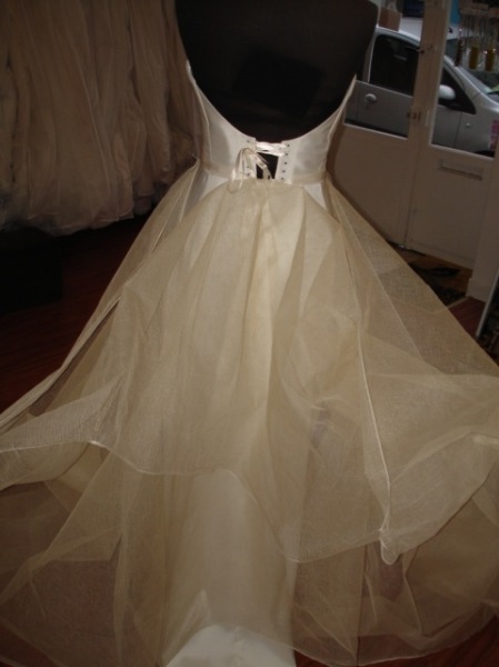 Retouche plus classique, le bustier a été quelque peu transformé pour ôter les bretelles et « arrondir » le tombé.