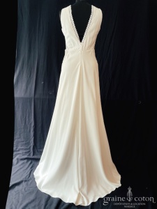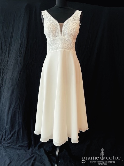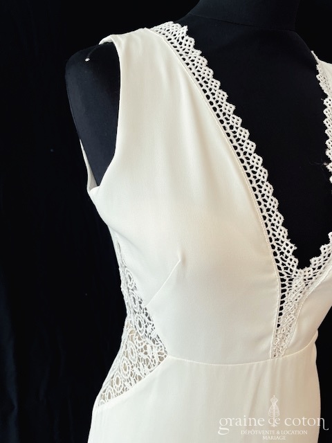 Robe une pièce ivoire : top avec larges bretelles froncées en mousseline, dentelle de Calais. Jupe fourreau fluide en mousseline légère, pas de traîne. Esprit Gatsby années 20, raffinée et …