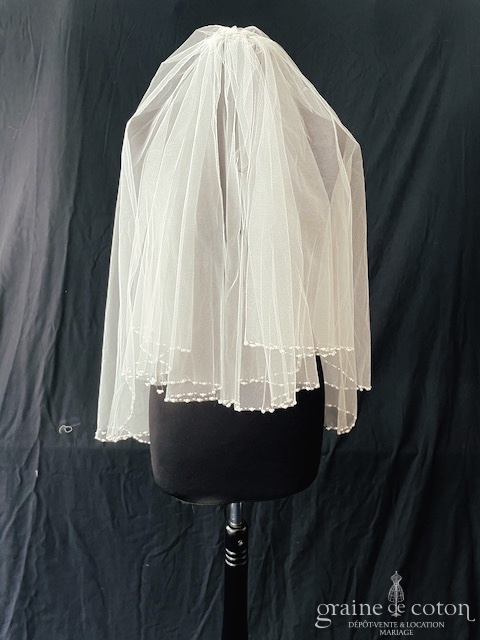 Voile long Reina de 2,50 mètres en tulle ivoire clair bordé d’une dentelle de Chantilly. Monté sur peigne, avec rabat avant de 50 cm.